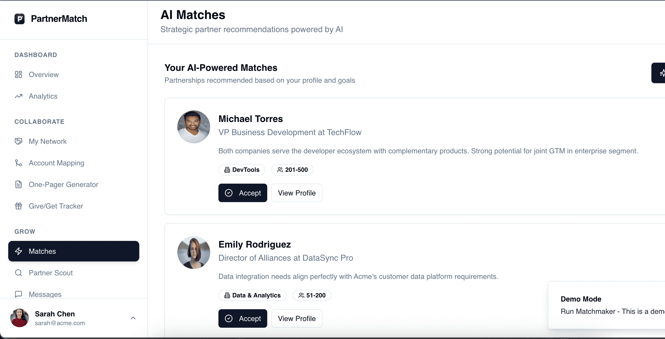 This is the engine behind PartnerMatch.co. We don't just show you a list of companies; our AI acts as a matchmaker, filtering out the noise so you only spend time on the 5% of partners who are a 10/10 fit.